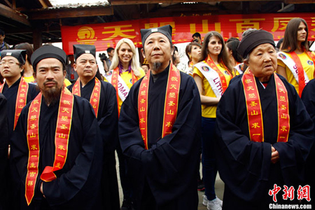 On May 6, contestants of 2012 Miss Tourism International from 60 countries and regions all over the world came to Tianzhao Mountain in Guangyuan City, southwest China's Sichuan Province. They blessed for world peace as well as paid tribute to Wu Zetian, the only woman in the history of China to assume the title of Empress in Tang Dynasty (AD 618-907).