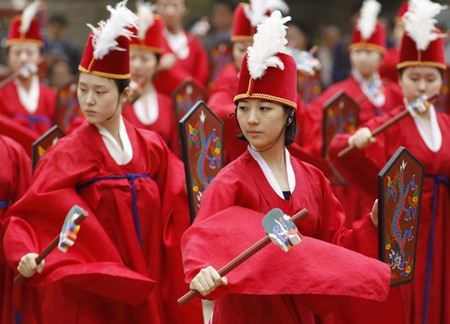 University students majoring in Korean traditional dance wear traditional costumes as they dance during the grand Confucian ceremony of Seokjeon in Seoul.[Photo/Agencies]