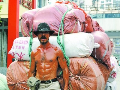 Yan Jiman, 47 years old, now has accidently created national buzz due to his strong and muscular body chastened by years of hard work. Tall and modest in manners, the half-naked man often wears a black hat, cropped pants and a pair of black canvas shoes. His abdominal muscles are obvious and strong. He looks like one of those daring and handsome characters in the movies.
