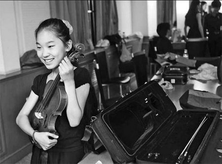 Wang Jinghan prepares backstage for a concert at the Middle School attached to the Central Conservatory of Music, where she has studied violin for four years. (Source: China Daily/Zou Hong)