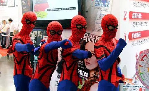 Four "spider-man" attract visitors' attention during a book fair in Shanghai Exhibition Center, east China's Shanghai, Aug. 15, 2012. About 500 domestic publishing companies participated in the book fair which opened on Wednesday.[Photo/Xinhua]