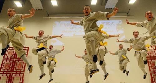 Disciples of China's famed Shaolin Temple perform at the opening ceremony of the 2012 European Shaolin Culture Festival in Berlin, Germany, Sept. 7, 2012. Shaolin Kungfu Test Conference, photo show of Shaolin culture and some other events will be held during the festival.
