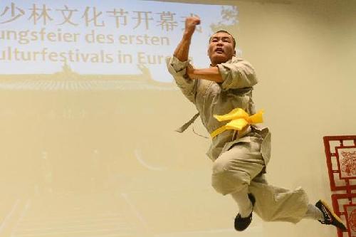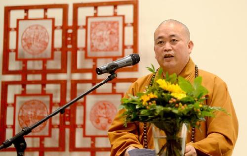 Shi Yongxin, the abbot of China's famed Shaolin Temple, addresses the opening ceremony of the 2012 European Shaolin Culture Festival in Berlin, Germany, Sept. 7, 2012. Shaolin Kungfu Test Conference, photo show of Shaolin culture and some other events will be held during the festival.
