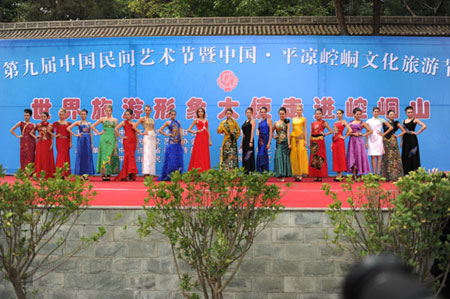 Girls representing 8 different countries and regions as world tourism image ambassadors presented a fashion show on Kongtong Mountain at the 9th China Folk Art Festivalon in Pingling city, Gansu Province, on September 12, 2012.[Photo/chinadaily.com.cn]