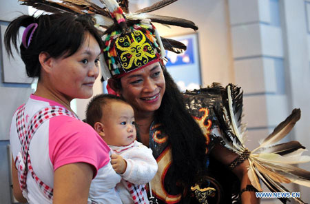A visitor and her baby pose for photos with an Indonesian performer at the ninth China-ASEAN Expo in Nanning, capital of south China's Guangxi Zhuang Autonomous Region, Sept. 25, 2012. The ninth China-ASEAN Expo was open to the public on Tuesday. (Xinhua/Chen Ruihua)