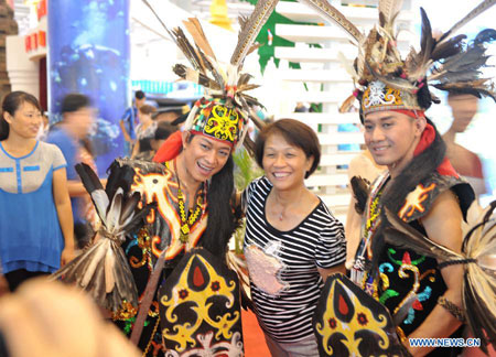 A visitor poses for photos with Indonesian performers at the ninth China-ASEAN Expo in Nanning, capital of south China's Guangxi Zhuang Autonomous Region, Sept. 25, 2012. The ninth China-ASEAN Expo was open to the public on Tuesday. (Xinhua/Zhou Hua)
