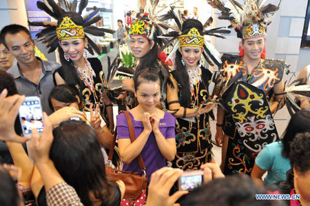 Visitors pose for photos with Indonesian performers at the ninth China-ASEAN Expo in Nanning, capital of south China's Guangxi Zhuang Autonomous Region, Sept. 25, 2012. The ninth China-ASEAN Expo was open to the public on Tuesday. (Xinhua/Zhou Hua)