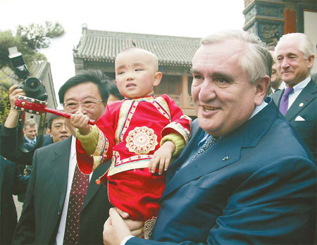 Former French prime minister Jean-Pierre Raffarin held a child when he visited the Shenyang Imperial Palace in Shenyang, Liaoning province, in April, 2005. Wang Qiang / for China Daily