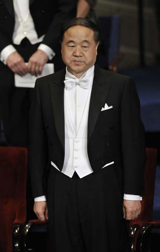 Laureates of the 2012 Nobel Prize for Physiology or Medicine John B. Gurdon (L) of Britain and Shinya Yamanaka of Japan (2nd L) sit with winner of the 2012 Nobel Prize for Literature Mo Yan (2nd R) of China and joint laureate for the 2012 Nobel Prize for Economic Alvin Roth of the U.S. during the Nobel Prize award ceremony at the Stockholm Concert Hall in Stockholm December 10, 2012.[Photo/Agencies]