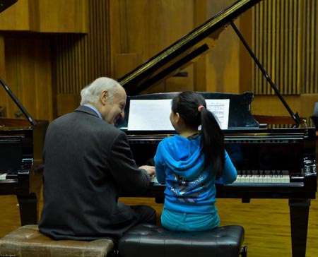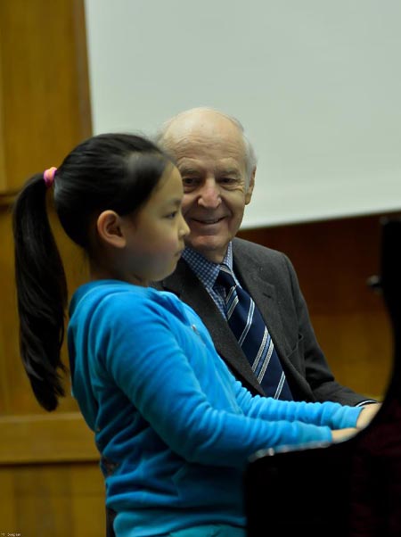 Israeli pianist Arie Vardi plays 4-hands with Chinese 8-year-old pianist Wang Yalun during the Chinese-Israeli Piano Master Classes in Jerusalem Music Center on Jan.1, 2013.