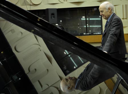 Israeli pianist Arie Vardi stands by a piano during the Chinese-Israeli Piano Master Classes in Jerusalem Music Center on Jan.1, 2013.