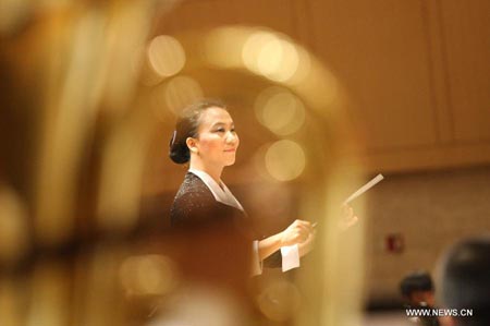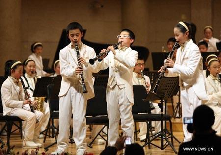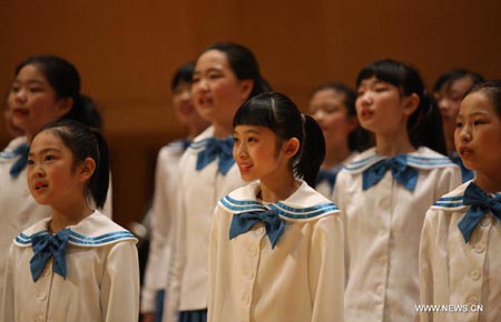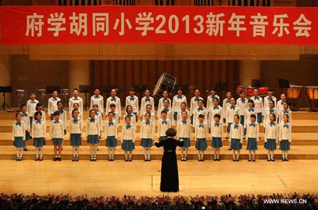 Members of the chorus of Beijing Fuxue Lane Primary School sing a song at the New Year's Concert in Beijing, capital of China, Jan. 5, 2013.