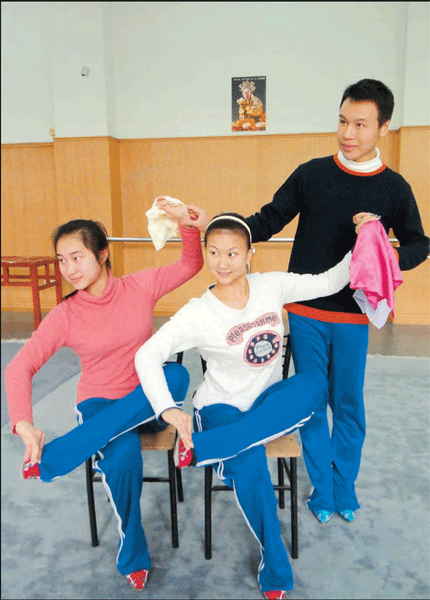 Nandan artist Mou Yundi instructs students Xiong Chenyu (left) and Zeng Qiuling in how to assume positions wearing tiny shoes for "bound feet."