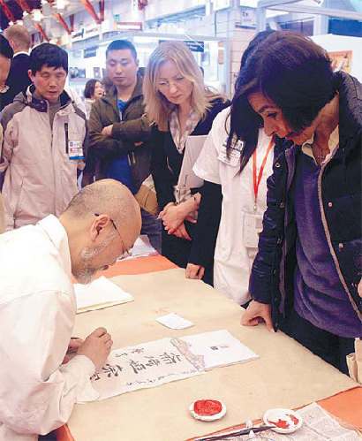 Visitors line up for calligraphic work by the Chinese artist Fan Dachuan at the 2012 London Book Fair. China was honored as the Market Focus country for the first time, with books about Chinese language and learning calligraphy being popular at the fair. [Bai Xu / Xinhua]