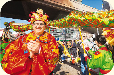 A foreign “god of wealth” wishes overseas Chinese in San Francisco happy new year at a “snake eye-dotting” ceremony in the city’s Chinatown.(Xinhua Photo)