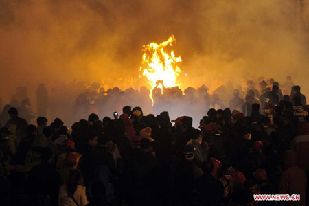 Locals and tourists enjoy the annual firecracker dragon festival to mark the Spring Festival, or Chinese Lunar New Year, in Binyang County, south China's Guangxi Zhuang Autonomous Region, Feb. 20, 2013. Over 100 firecracker dragons were set off at the festival. Included in China's national intangible cultural heritage list in 2008, the traditional carnival has a history of over one thousand years allegedly.