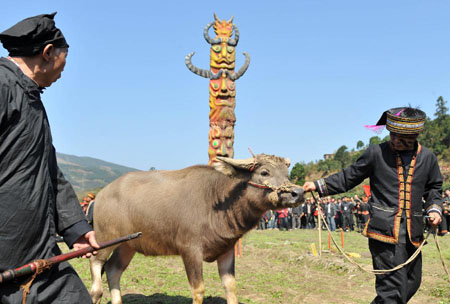 Villagers of Yao ethnic group sacrifice a bull to Panwang (King Pan), the legendary ancestor of the Yao people, at Shikou Village of Sanjiang Township in Gongcheng Yao Autonomous County, south China's Guangxi Zhuang Autonomous Region, Feb. 23, 2013.