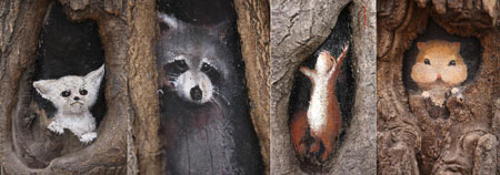Combo photo taken on March 1, 2013 shows tree hollow paintings created by Wang Yue, a local college student, at Jiuzhong Street in Shijiazhuang, capital of north China's Hebei Province.