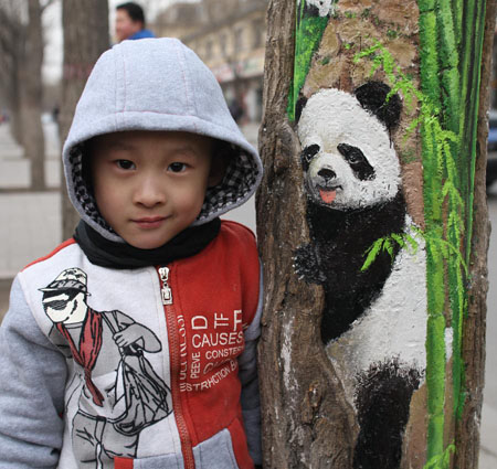 A young boy poses for photo with a tree hollow painting created by Wang Yue, a local college student, at Jiuzhong Street in Shijiazhuang, capital of north China's Hebei Province, March 1, 2013.
