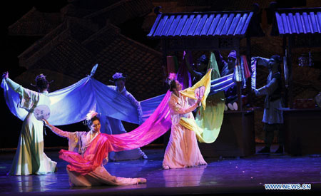 Dancers from China Jinling Dance Company perform the dance drama The Peony Pavilion in Sydney, Australia, on March 2, 2013. The dancers were on the Image China tour through the United States to New Zealand and Australia during which they introduced the mesmerizing love story of Ming Dynasty (1368-1644).