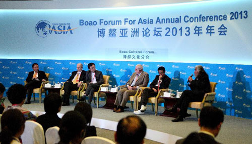 Guests and delegates attend the session of "Boao Cultural Forum" at the Boao Forum for Asia (BFA) Annual Conference 2013 in Boao, south China's Hainan Province, April 8, 2013. (Xinhua/Xu Zijian)