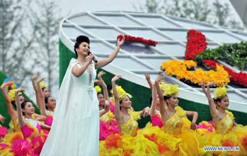 Singer Liu Yuanyuan performs during the opening ceremony of the 9th China (Beijing) International Garden Expo in Beijing, capital of China, May 18, 2013. The expo opened in southwestern Fengtai district in Beijing on Saturday and will last till Nov. 18, 2013. Garden designs from 69 Chinese cities and 29 countries will be presented. (Xinhua/Li Wen)