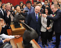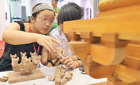 Shanxi Museum's staff members work on the "toy bricks", miniature wooden blocks.