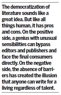 The democratization of literature sounds like a great idea. But like all things human, it has pros and cons. On the positive side, a genius with unusual sensibilities can bypass editors and publishers and face the final consumers directly. On the negative side, the absence of barriers has created the illusion that anyone can write for a living regardless of talent. In reality, the removal of the middlemen (editors and publishers) has shifted the cost of winnowing out the worthless to the readers. Because virtual space does not entail any cost like page layout and printing, a literature website can function like a kitchen sink.