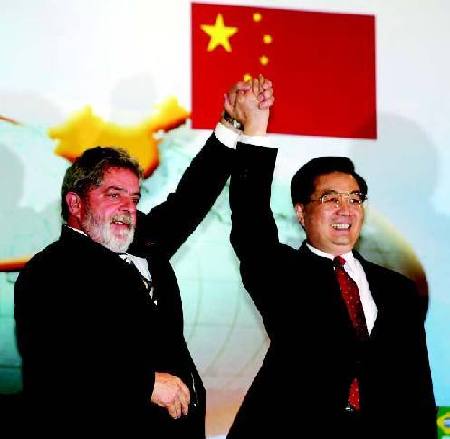 Brazilian President Luiz Inacio Lula da Silva and Chinese President Hu Jintao celebrate at closing of investment and trade seminar.