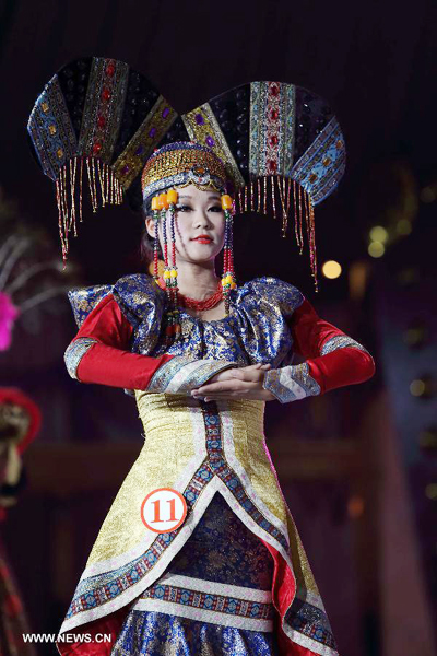 A model presents a Mongolian ethnic costume during the costume contest of the 10th China Mongolian ethnic costume arts festival in Tongliao city, North China's Inner Mongolia autonomous region, Aug 24, 2013. A total of 68 delegations including more than 1,000 contestants countrywide attended the two-day festival which opened on Saturday. [Photo/Xinhua]