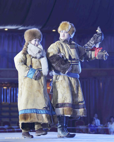 Models present Mongolian ethnic costumes during the costume contest of the 10th China Mongolian ethnic costume arts festival in Tongliao city, North China's Inner Mongolia autonomous region, Aug 24, 2013. A total of 68 delegations including more than 1,000 contestants countrywide attended the two-day festival which opened on Saturday. [Photo/Xinhua]