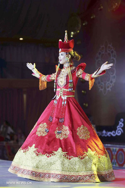 A model presents a Mongolian ethnic costume during the costume contest of the 10th China Mongolian ethnic costume arts festival in Tongliao city, North China's Inner Mongolia autonomous region, Aug 24, 2013. A total of 68 delegations including more than 1,000 contestants countrywide attended the two-day festival which opened on Saturday. [Photo/Xinhua]