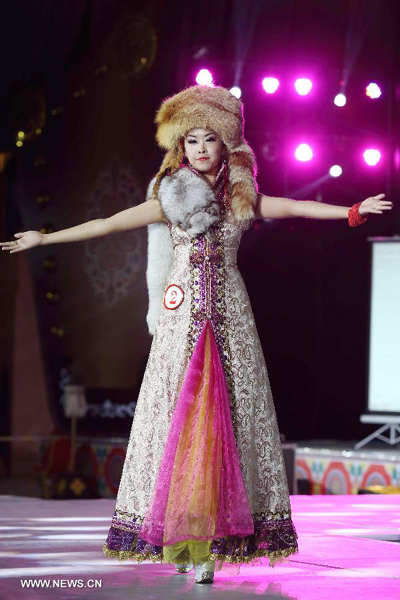 A model presents a Mongolian ethnic costume during the costume contest of the 10th China Mongolian ethnic costume arts festival in Tongliao city, North China's Inner Mongolia autonomous region, Aug 24, 2013. A total of 68 delegations including more than 1,000 contestants countrywide attended the two-day festival which opened on Saturday. [Photo/Xinhua]