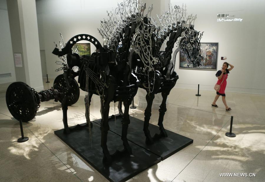 A visitor walks past an installation work named "Ashvins" in the National Art Museum of China (NAMOC) in Beijing, capital of China, Aug. 26, 2013. The "Interactive Perspectives -- Contemporary Art Exhibition Across the Taiwan Straits 2013" kicked off at the NAMOC Monday, showcasing works of 36 artists from both Chinese mainland and Taiwan. [Xinhua/Ren Zhenglai]