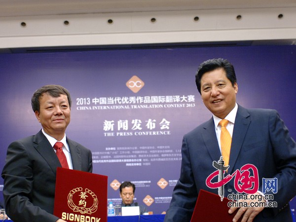 Zhang Yanbin (left), director of the third office of the State Council Information Office, and Guo Xiaoyong, executive vice president of the CIPG, signed the cooperation contract at the launching ceremony of the China International Translation Contest 2013, Sept. 2, 2013. [China.org.cn]