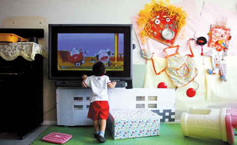 A child gets up close to watch a cartoon at a kindergarten in Shanghai. As the new semester begins this week, some kindergartens comfort anxious and sometimes crying newcomers with familiar cartoons. (Shanghai Daily/Yang Shenlai)