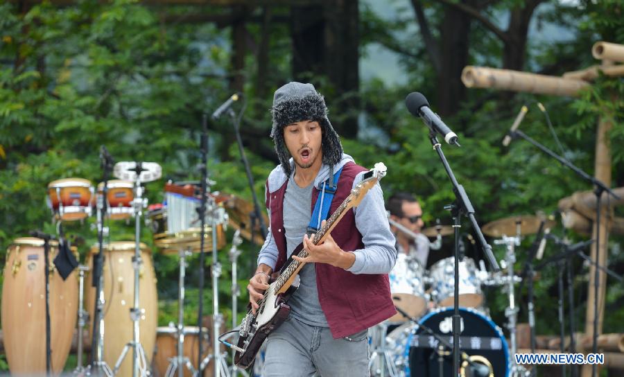 A member of the "Making Faces" from the US performs at the 2013 Zhangjiajie International Country Music Week, in Zhangjiajie, central China's Hunan province, Aug. 31, 2013. The five-day music week, which attracted 22 overseas bands and eight domestic bands in total, kicked off Saturday in the famous tourist attraction Zhangjiajie. [Photo: Xinhua/Bai Yu]