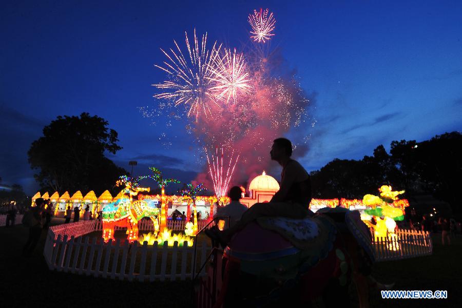 City dwellers watch the fireworks at the "Mid-Autumn Festival at The Gardens 2013" at Singapore's Gardens by the Bay on Sept. 13, 2013. A light-up ceremony is held at the "Mid-Autumn Festival at The Gardens 2013" in Singapore on September 13. [Xinhua/Then Chih Wey]