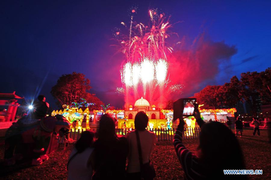 City dwellers watch the fireworks at the "Mid-Autumn Festival at The Gardens 2013" at Singapore's Gardens by the Bay on Sept. 13, 2013. A light-up ceremony is held at the "Mid-Autumn Festival at The Gardens 2013" in Singapore on September 13. [Xinhua/Then Chih Wey]