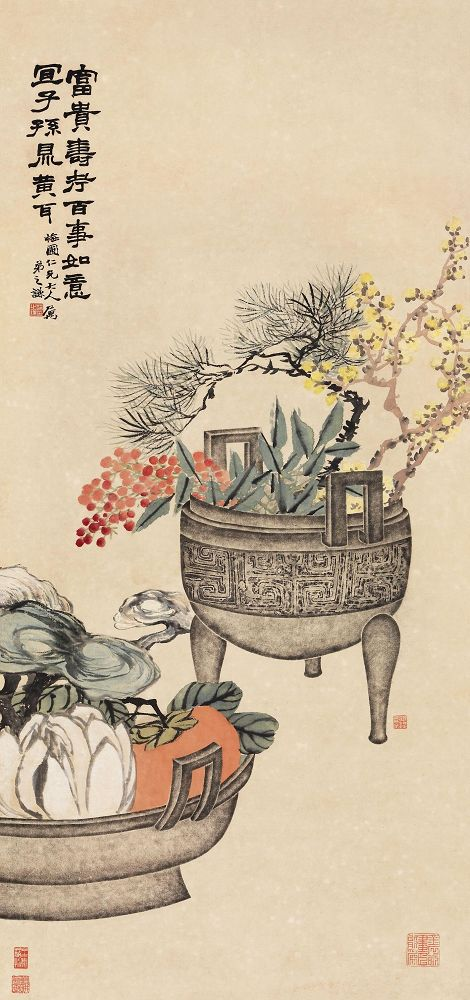 The Painting of Wealth, Honor and Longevity was made by renowned Chinese calligrapher Zhao Zhiqian, a seal carver and painter in the late Qing Dynasty (1644-1911).