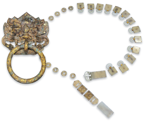 Valuable relics found in the emperor's burial site include four lion-shaped doorknockers and a 13-ring jade belt decorated with gold.