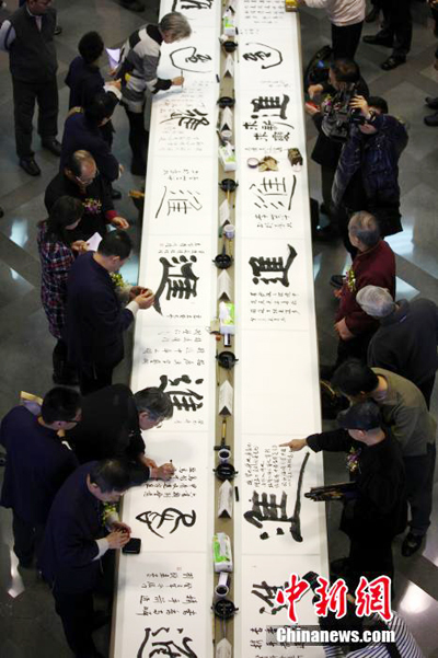Famous calligraphers from Taiwan and Fujian write "Jin" in different shapes during the cross-strait word of year announcement ceremony on Dec. 18, 2013. (Chinanews.com)