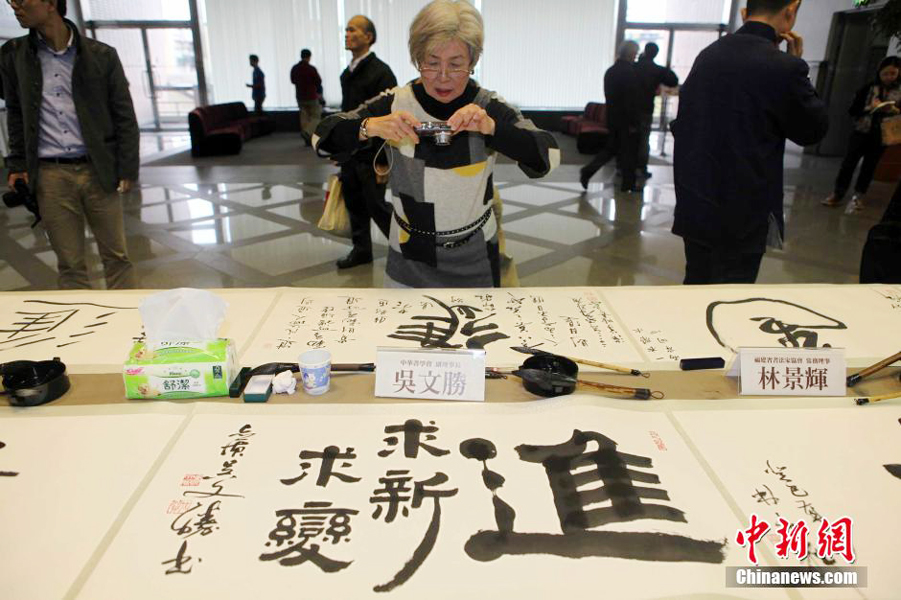 Famous calligraphers from Taiwan and Fujian write "Jin" in different shapes during the cross-strait word of year announcement ceremony on Dec. 18, 2013. (Chinanews.com)