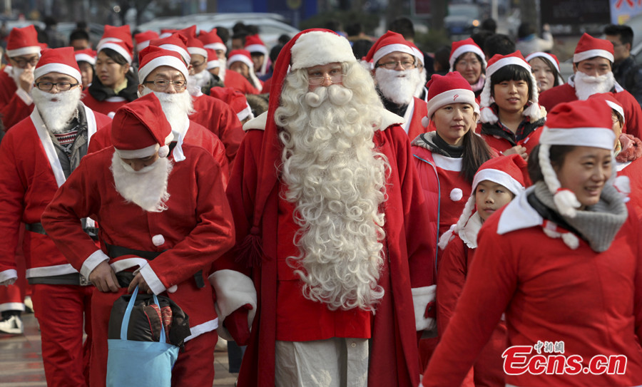 A Santa Claus (C front), from Santa Claus Village at Lapland of Northern Finland, takes part in a parade to mark the upcoming Christmas Day in Jinan, capital city of east China's Shandong province on December 22, 2013. [Photo: China News Service / Zhang Yong]
