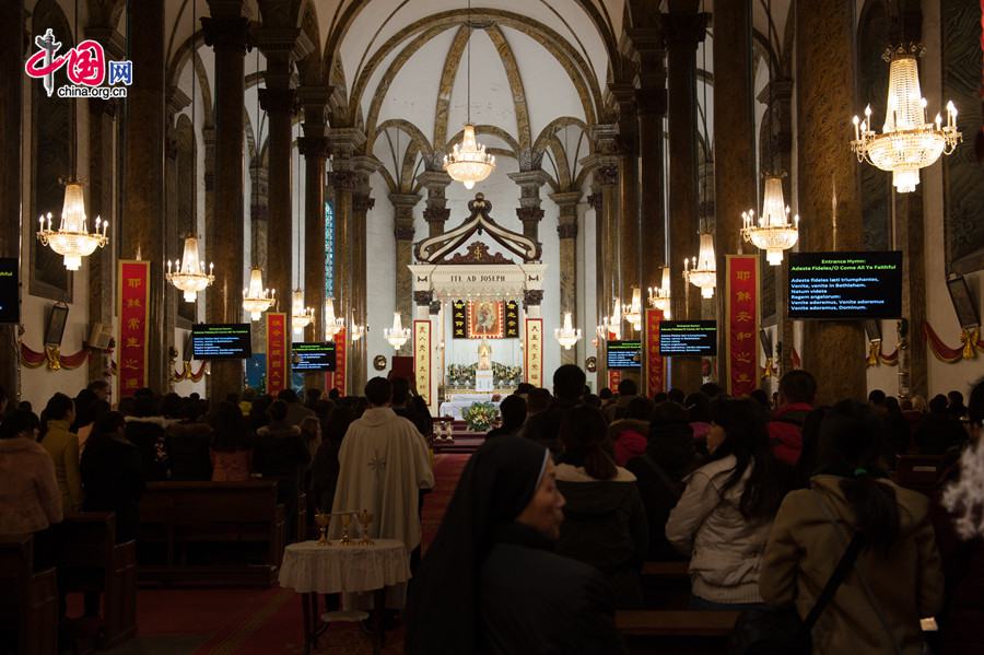 St. Joseph's Church (also known as Wangfujing Church, Dongtang, or the East Cathedral) in Beijing holds an English-language mass on the Christmas Day's afternoon, Dec. 25, 2013 to accommodate the neccessity of foreign Christians in Beijing, the Chinese capital. (Photo by Chen Boyuan / China.org.cn)