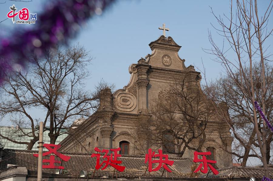 The bronze statue of Fr. Matteo Ricci, an Italian missionary and Jesuit member who helped found the Cathedral of the Immaculate Conception (colloquially known as the Xuanwumen Church, the South Church, or Nantang) in Beijing stands outside of the church gate on Christmas Day, Dec. 25, 2013. (Photo by Chen Boyuan / China.org.cn)