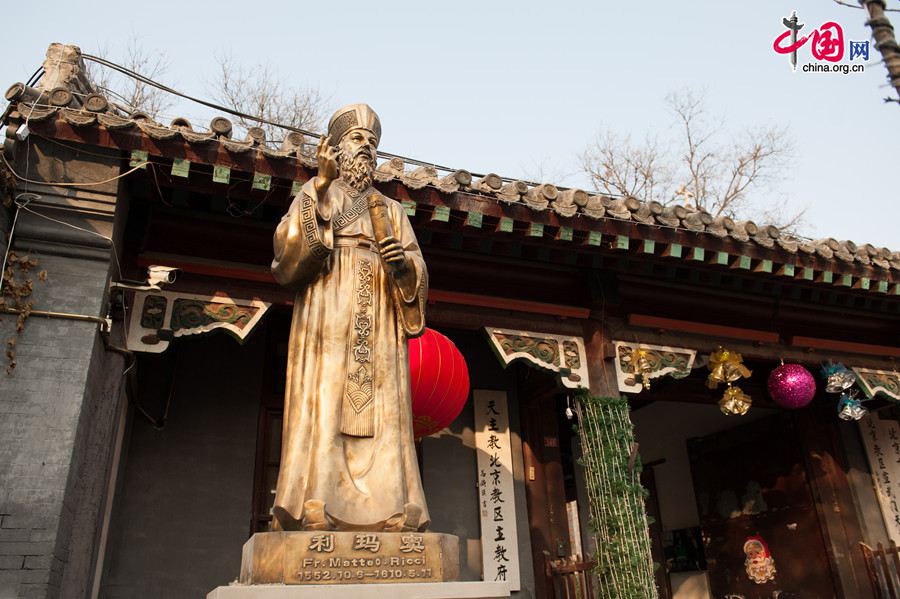 The bronze statue of Fr. Matteo Ricci, an Italian missionary and Jesuit member who helped found the Cathedral of the Immaculate Conception (colloquially known as the Xuanwumen Church, the South Church, or Nantang) in Beijing stands outside of the church gate on Christmas Day, Dec. 25, 2013. (Photo by Chen Boyuan / China.org.cn)