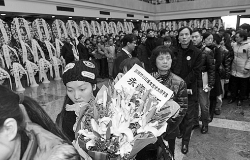 Banners that read "Her life belongs to art" and "Her art belongs to people" hung from the two sides of Hong's coffin at the funeral.