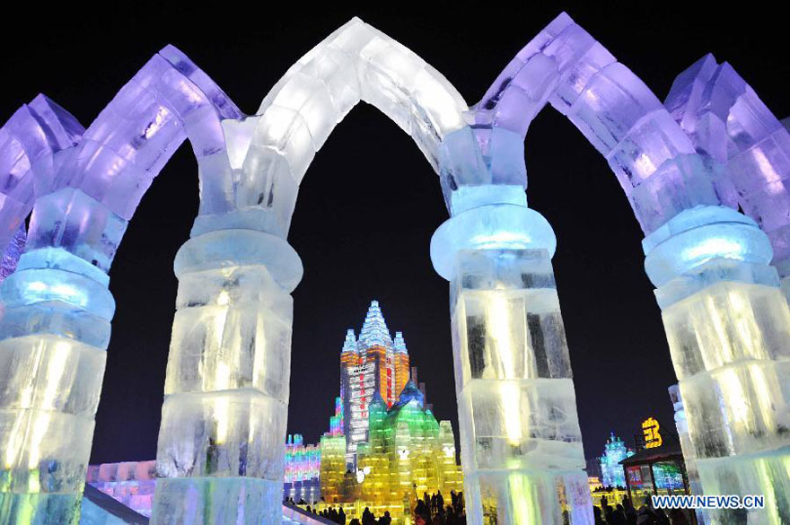 Visitors tour in the Ice and Snow World in Harbin, capital of northeast China's Heilongjiang province, Jan. 5, 2014. The 30th Harbin International Ice and Snow Festival opened here on Sunday night. Harbin's ice and snow tourism industry has developed for 50 years since 1963. [Xinhua/Wang Jianwei]