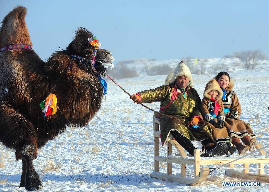 People enjoy camel-sledding during a culture event in Xi Ujimqin Qi, north China's Inner Mongolia Autonomous Region, Jan. 5, 2014. A camel culture festival was held here on Sunday. (Xinhua/Ren Junchuan)